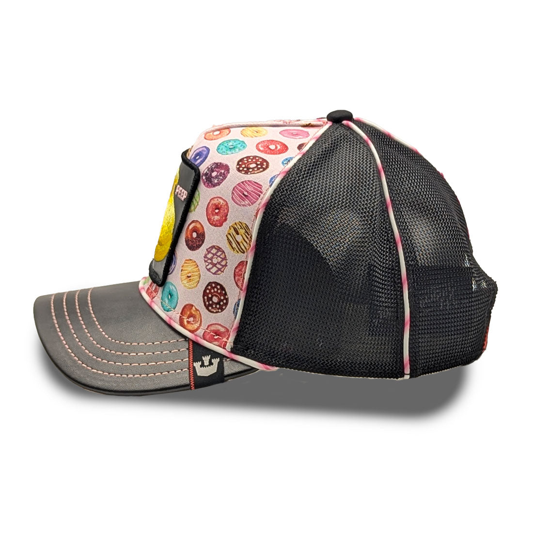 Das Frontpanel aus robustem Material ist mit bunten Donut-Motiven verziert – perfekt für alle, die auffallen möchten! Das gestickte Patch zeigt ein gelbes Küken ("Peep") und setzt einen witzigen Akzent, der garantiert Aufmerksamkeit erregt.